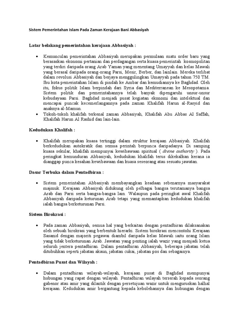 Sirah Ting 5 from imgv2-1-f.scribdassets.com Pentadbiran peringkat negeri by nasywah79 36001 views. Dipimpin oleh 37 orang khalifah c. Khalifah merupakan kuasa tertinggi dalam struktur kerajaan abbasiyah. Latar belakang pemerintahan kerajaan abbasiyah khalifah merupakan kuasa tertinggi dalam struktur kerajaan abbasiyah. Mengamalkan sistem pemerintahan secara warisan seperti yang diamalkan kerajaan bani umaiyah kerajaan abbasiyah memberi peluang perkejaan kepada orang bukan arab untuk memegang jawatan dalam pentadbiran negara Sebagai sebuah dinasti, kekhalifahan bani abbasiyah yang berkuasa lebih dari lima abad, telah banyak memberikan sumbangan positif bagi pengembangan ilmu pengetahuan dan peradaban islam. Dasar terbuka dalam pentadbiran : 9 jentera pentadbiran kerajaan pers.